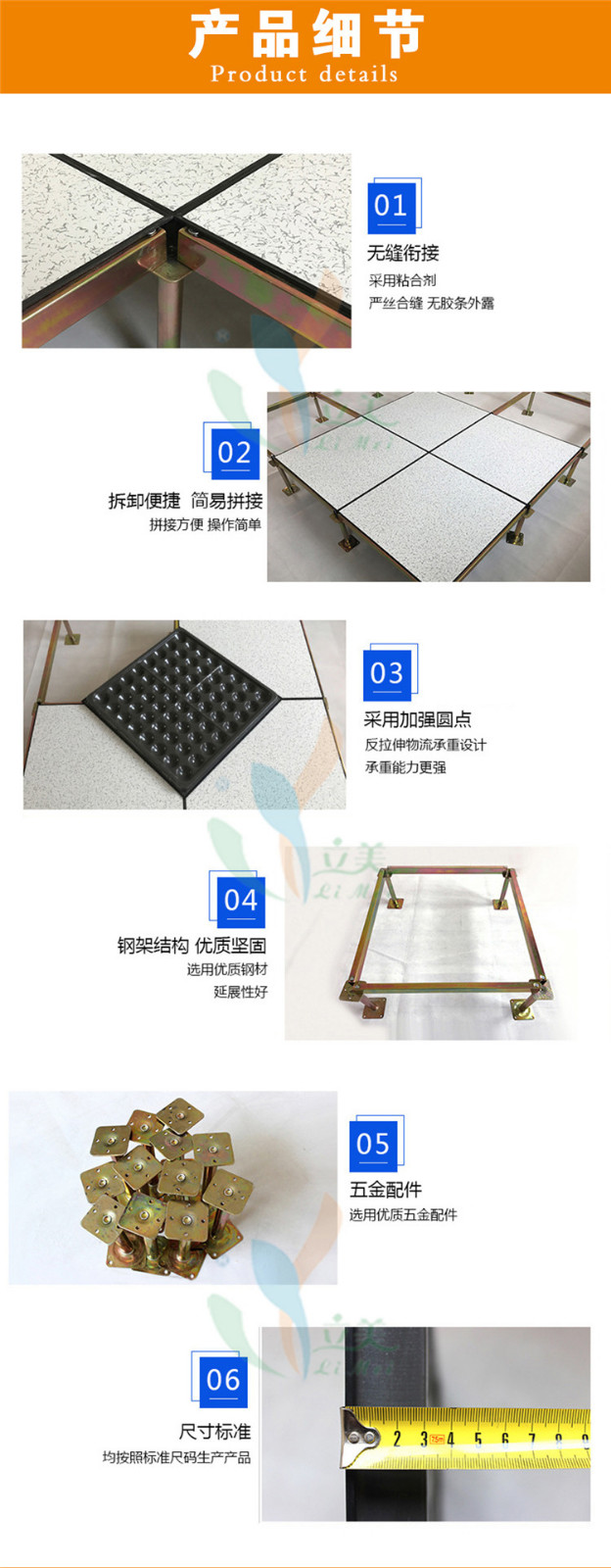 安装维护便捷:采用模块化设计,地板之间互换性强,组装灵活,可通过特殊的拼接方式进行拼装,安装方便迅速,且便于拆卸和更换,后期维护工作相对简单,只需定期清洁、检查地板整体状况、紧固拼接件等即可。